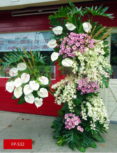 These Funeral Flower Standee, Standing Arrangement of Orchids, Anthuriums and Mums (FP-S32) is one of our funeral flower arrangement with free funeral flower delivery. Compose of Standing Arrangement of Orchids, Anthuriums and Mums.