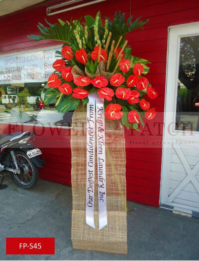These Funeral Flower Standee, Standing Arrangement of Orange Anthuriums (FP-S45) is one of our funeral flower arrangement with free funeral flower delivery. Compose of Standing Arrangement of Orange Anthuriums.