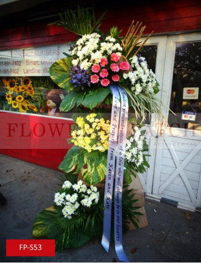 These Funeral Flower Standee, Standing Arrangement of Assorted Colored Mums, Gerberas with Statice (FP-S53) is one of our funeral flower arrangement with free funeral flower delivery. Compose of Standing Arrangement of Assorted Colored Mums, Gerberas with Statice.