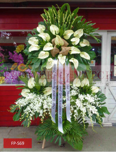 These Funeral Flower Standee, Standing Arrangement of White Anthuriums, Orchids and Tuberoses (FP-S69) is one of our funeral flower arrangement with free funeral flower delivery. Compose of Standing Arrangement of White Anthuriums, Mums and Tuberoses.