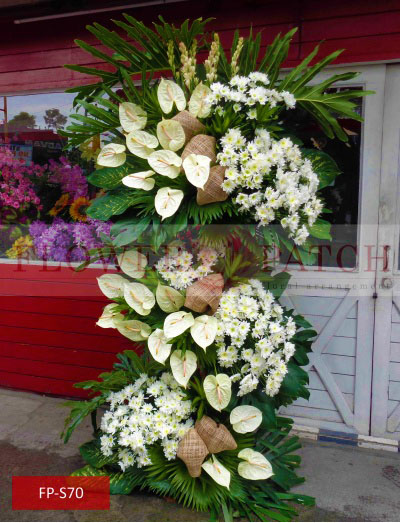 These Funeral Flower Standee, Standing Arrangement of White Anthuriums, Mums and Tuberoses (FP-S70) is one of our funeral flower arrangement with free funeral flower delivery. Compose of Standing Arrangement of White Anthuriums, Mums and Tuberoses.